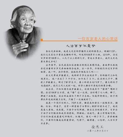 大足区摄影家协会在区相关单位的大力支持下,发起“关爱百岁老人、采访百岁老人”的摄影活动,历史两年。他们跋山涉水,足迹踏遍全区各地,探望和拍摄了全区60位百岁老人,并在此基础上了出版了《大足百岁人——重庆市大足区百岁老人集锦(一)》一书。该画册全方位、多层面展现了大足百岁老人的精神风貌和生活状态,生动翔实记录了百岁老人的人生足迹及丰富多彩的内心世界,并且探究了他们的生活习惯和养生奥秘。本书不仅对老年人健康长寿具有指导意义,对中年人如何把握健康也具有重要的启示,对青少年弘扬尊老敬老爱老传统美德具有指导意义。
